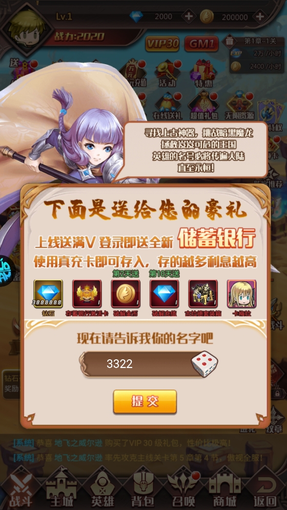 1、進入游戲后,先創建屬于你的勇士姓名,正式開啟在勇者大陸的冒險征程。