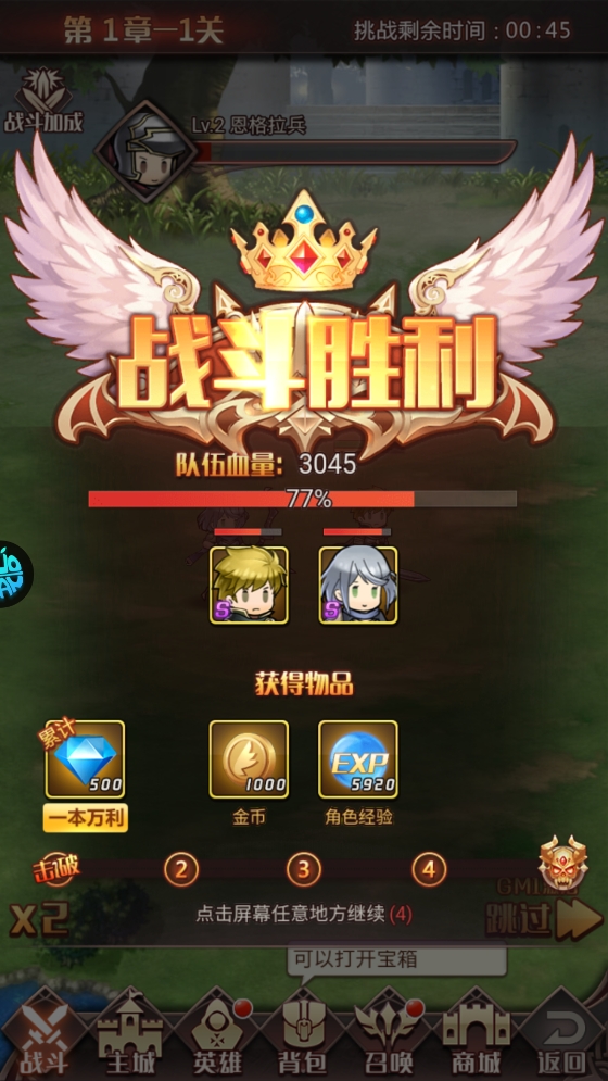 4、戰斗勝利后,能獲得各類物品獎勵,這些資源可用于培養英雄,助力你提升戰力對抗暗黑魔龍。