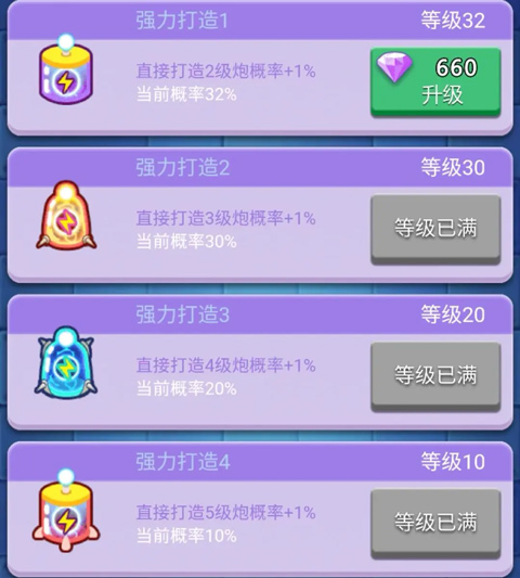 2、鉆石最主要的花銷就是先把強力打造升滿。升滿以后再管其他的。如圖,這四個強力打造先都升到10級,然后是3-2-1依次升滿