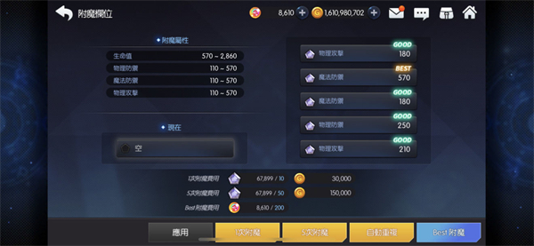 附魔:可以為裝備進行附魔,左邊為可以洗的屬性,右邊則是洗出來的屬性,輸出洗對應的攻擊,暴擊率和冷卻,技能增傷等,輔助盾洗生命防御以及減傷冷卻等,前期沒必要一定追求best,只要great就可以用,可以保存一下,洗到更好的再替換,材料主要來源于次元獸與遠征;