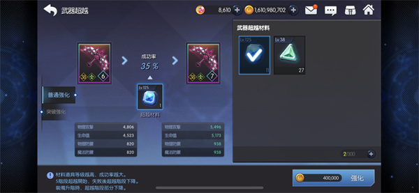 超越:目前超越只有武器開放,能提升大量的屬性,裝備等級越高提升也就越大,1-4只會失敗不會掉級,5-9失敗會掉級,6-7有保底超越,8-9只能通過最高級石頭才能100%成功(掉率十分感人),超越時會顯示概率,前期隨便拍賣買點低級石頭升個4就行,后期在考慮更高等級,因為升級裝備會掉級,建議升到最高后在進行超越,材料來源于愛拉西瑞斯之錘,需要高練度才能通關。