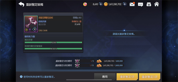 重新鑒定:可以重新鑒定裝備詞條,主要是第一詞條,選擇全部鑒定,輸出攻擊,輔助盾生命防御,第二詞條在洗好第一詞條后再洗,輸出為無視防御傷害,對boss傷害,暴擊傷害,暴擊率,pvp傷害,其中無視防御只有武器有,對boss傷害和pvp只有副武器有,可以看別人的裝備洗,材料主要通過Raid和次元裂隙獲取;