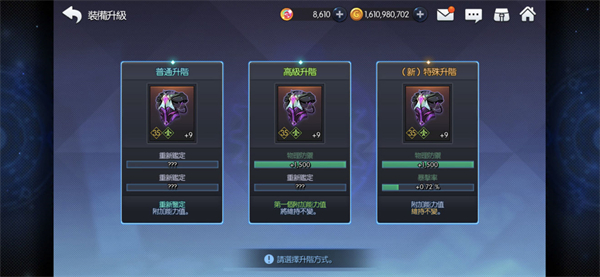 升級:主要進行裝備升級,例如從35裝備升到38裝備,有三種方式可以選擇,第一個是不保存任何屬性進行升級,要求材料也少,第二個是保存第一條屬性進行升級,重置其他屬性,第三個是全部保存,但需要特殊道具,一般只能氪金獲得,裝備升級素材主要通過Raid和次元裂隙獲取;