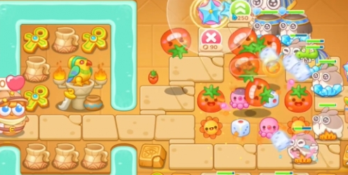 1、開局在右側建造兩個番茄炮臺,用來清理右側的道具