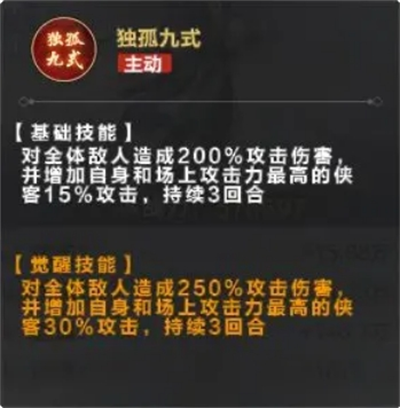 【基礎技能】:對全體敵人造成200%攻擊傷害;并增加自身和場上攻擊力最高的俠客15%攻擊,持續3回合。