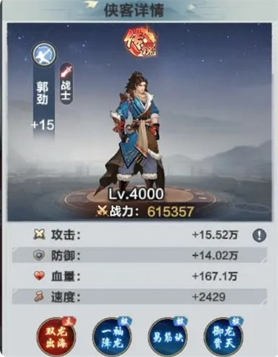 1號位置上陣戰士郭勁,作為一套陣容的主要輸出位置,郭勁每回合對目標造成流血傷害和額外攻擊傷害,在高額傷害的面前可以快速的解決面前的敵人,郭勁這位俠客也成為了通關演陣臺必不可少的一個關鍵。
