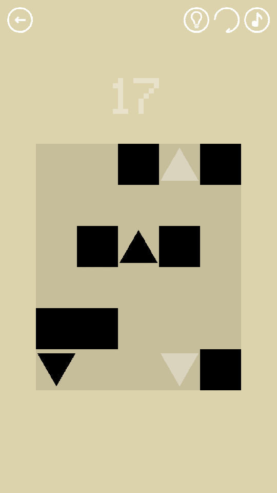 第十五關:右塊的功能是讓下個塊 順時針旋轉九十度,左塊的功能是跳過下一關塊,完成一個口形,點中間黑塊