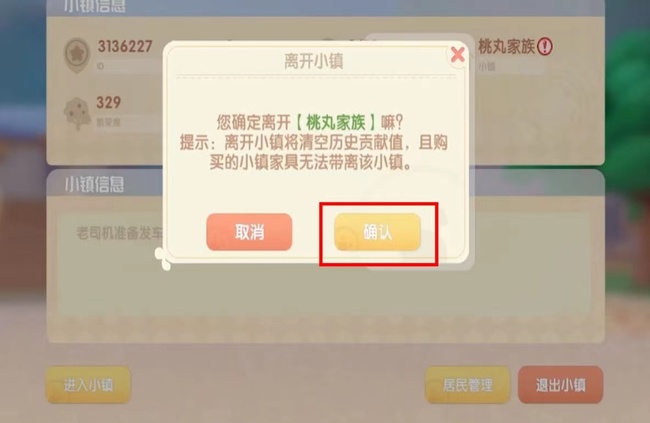 3、在彈出的選項(xiàng)框中,點(diǎn)擊右下角的“確認(rèn)”,即可退出小鎮(zhèn)。