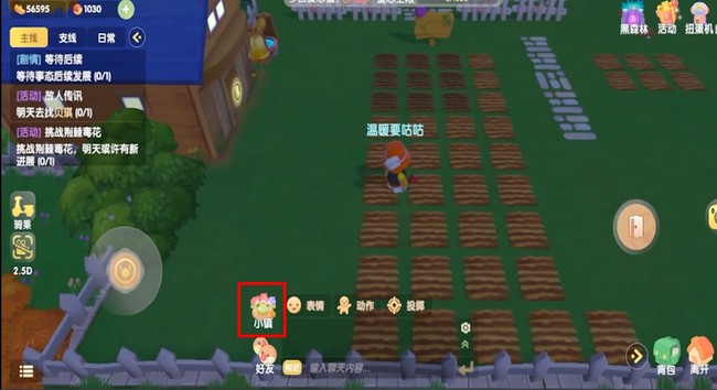 1、進(jìn)入游戲,點(diǎn)擊聊天欄右邊的“小鎮(zhèn)”,也可以在主菜單找到“小鎮(zhèn)”,點(diǎn)擊進(jìn)入,如圖所示。