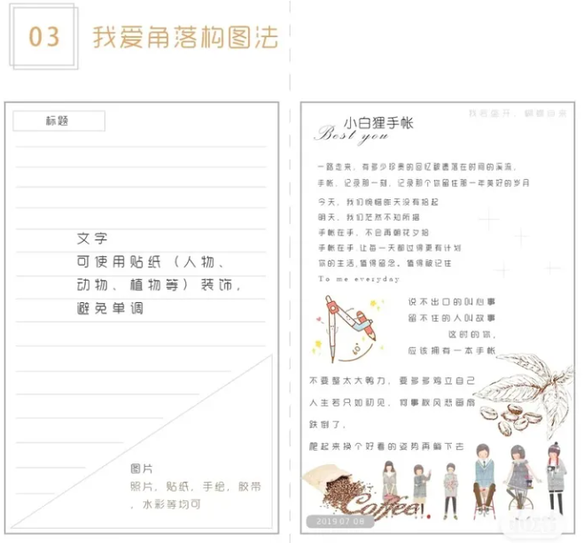 角落指的是四周的任意一個角,圖中以右下角為例。在右下角貼上或畫上好看的圖,構圖可以大膽一點,右下角的部分都可以占滿,不要太小。在空出來的地方自由發揮布置圖文即可,主要是寫文字,同時可以加一些貼紙和簡筆畫做裝飾。
