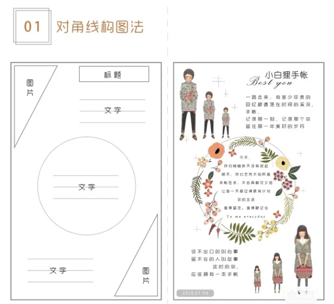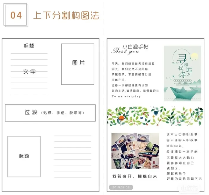 使用膠帶或細長的圖占據紙張中間的部位,把紙張分割為上下兩部分。分別在上下部分布局自己想寫的內容,內容布置可以自由發揮,例如可以使用一邊圖一邊文的形式。這樣上下分割構圖就新鮮出爐啦。