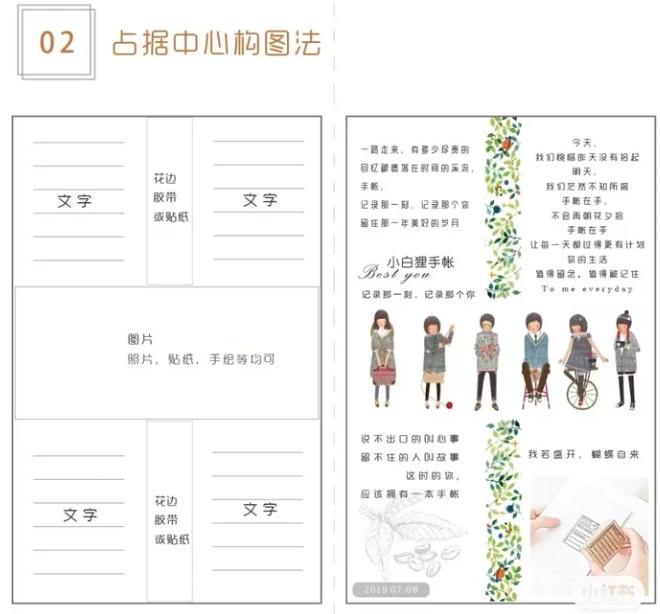 這里的中心指的是紙中間的一個十字。在橫向和縱向的中間都放上圖片元素(建議橫向的圖可以高一點,縱向的圖窄一點,可以直接使用膠帶)。四周空出來的部分寫上文字就大功告成啦。