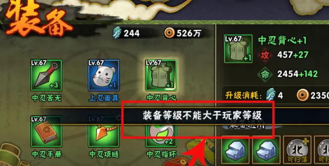 1、進(jìn)入游戲后點(diǎn)擊裝備按鈕,忍具根據(jù)玩家的等級(jí)進(jìn)行升級(jí)