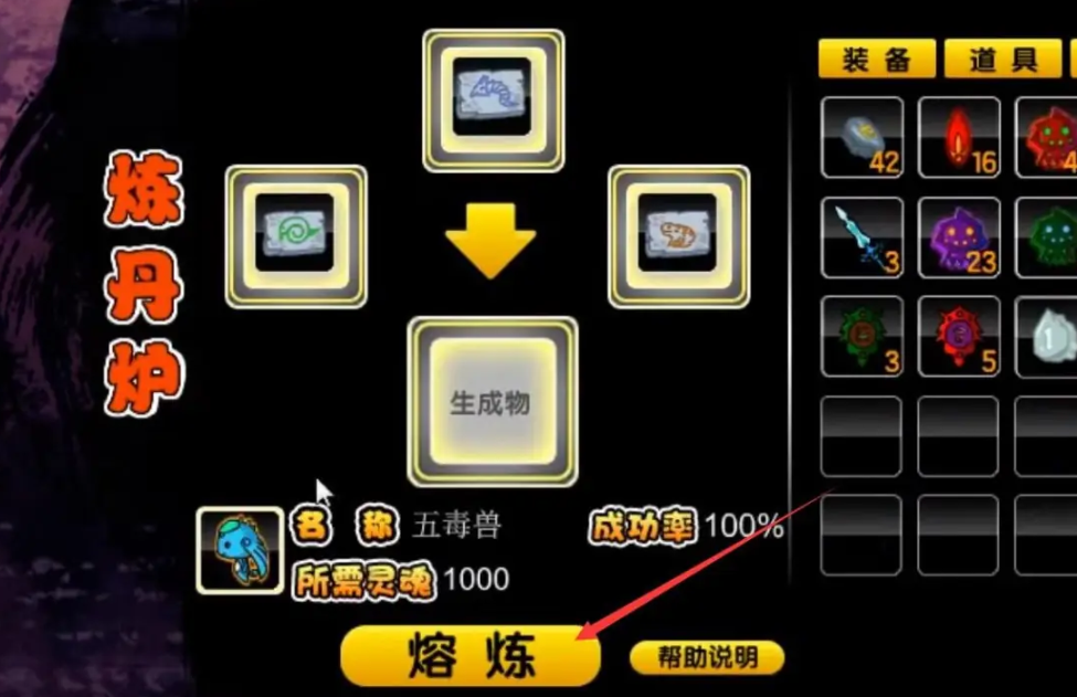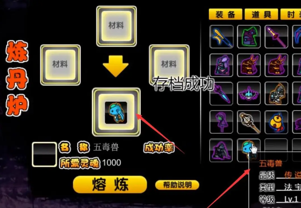 4、最后當(dāng)系統(tǒng)提示熔煉完成后,即可合成獲得五毒獸法寶