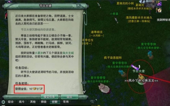 2、找到后和節日大師對話,即可領取清明時節雨紛紛任務