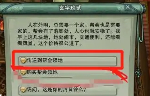 2、接著和NPC互動進行對話,在對話中選擇:傳送到幫會領地