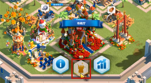 1、玩家進(jìn)入游戲后,在大廳內(nèi)選擇市政廳建筑,點(diǎn)擊中間黃色塔樓圖標(biāo)。