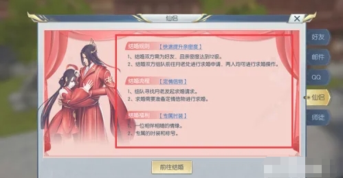3、在仙侶頁面可以看到關于結婚的規則、流程和福利,需要滿足親密度12級前往月老處進行操作;