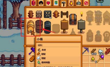 2、打開菜單制作頁面,點擊【釀酒桶】,隨后消耗30份木材、一個銅錠、一個鐵錠和一個橡樹樹脂,即可制作出一個釀酒的小桶。