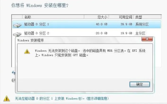14、如果出現提示無法在驅動器0的分區1上安裝Windows的故障問題,這是由于在EFI系統上Windows只能安裝到GPT磁盤內,具體怎么操作可以看這個教程解決:cnblogs.com/fozero/p/6390341.html。