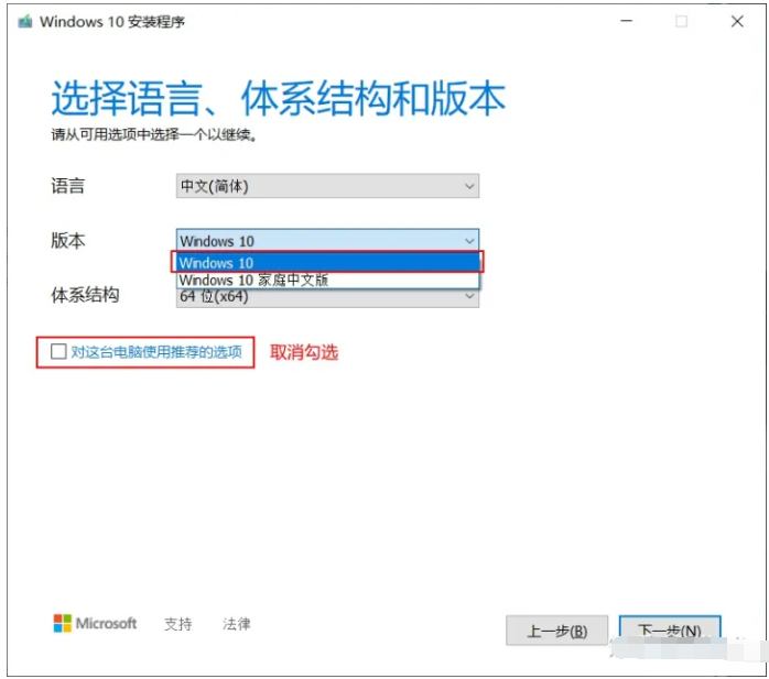 6、選擇Windows10(不建議大家家庭中文版,因為權限太低),內存大于等于4G就選擇64位。大家記得取消勾選“對這臺電腦使用推薦的選項”,因為不是這臺電腦要安裝,到時需要換到進不去系統的電腦上安裝。