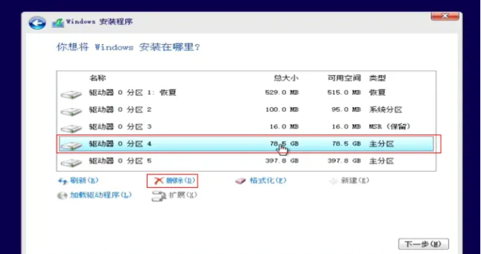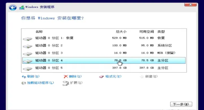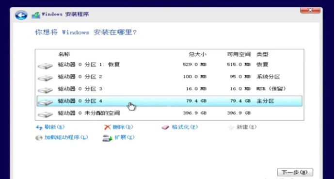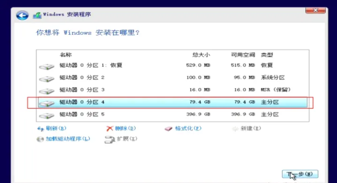 13、這里選擇最大的主分區(也就是你C盤能看到的)作為系統安裝的地方,點擊下一步。