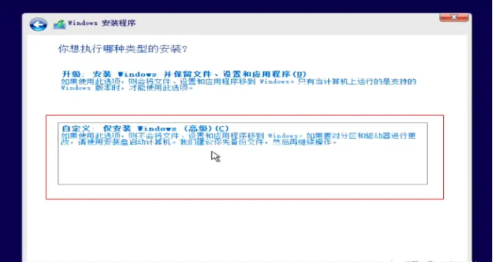 8、點擊接受協議,接著選擇自定義僅安裝Windows。