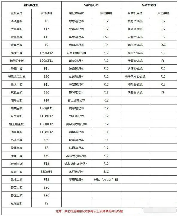 1、接著將U盤插入要安裝的電腦上,在開機出現品牌Logo的時候,快速按下對應的啟動按鍵,進入bios內設置u盤啟動。可參照下圖所示查找自己電腦的啟動熱鍵,如果沒有就自行百度查找即可。