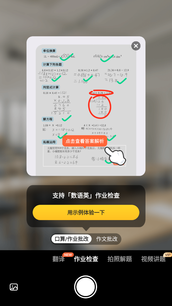 2、進入后對準拍照識別即可自動檢查,還可以查看解析講解,支持「數語英」作業檢查。