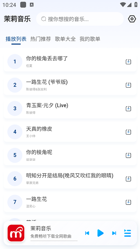 茉莉音樂最新版本是一款非常實用的音樂播放器,里面收集了海量音樂資源,熱門的華語、粵語歌曲等你來,一鍵下載緩存,隨時隨地都可以聽音樂,內置優質的資源渠道,實時更新各種新歌曲,操作輕松,音樂愛好者必備。