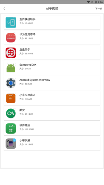 4、選擇需要發(fā)送的APP,點(diǎn)擊下一步(以app發(fā)送為例)
