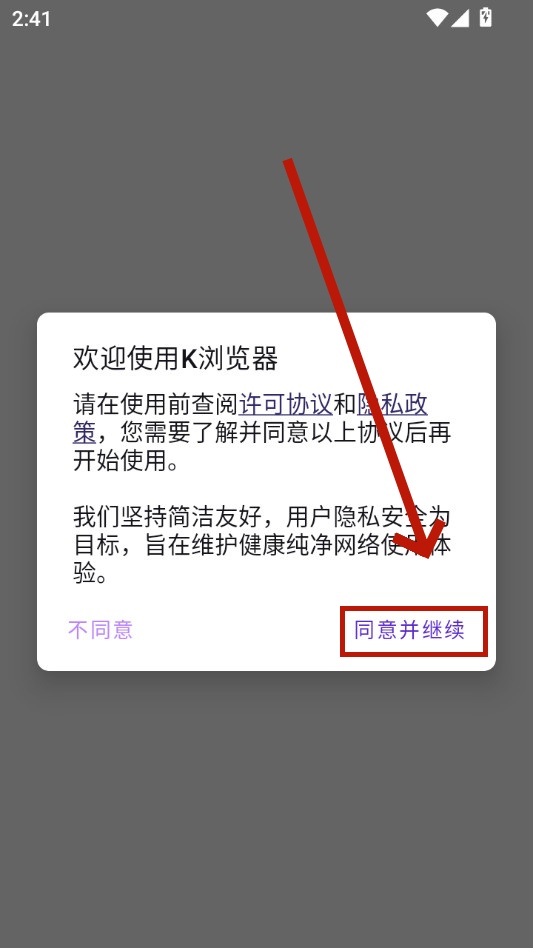 下載安裝并打開k瀏覽器app,點擊同意并繼續