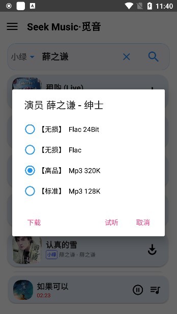 無損音質(zhì)下載:支持下載Flac、Mp3等格式音頻,根據(jù)網(wǎng)絡(luò)環(huán)境選擇“標準”到“超清母帶”等不同音質(zhì),下載后存儲至指定路徑。