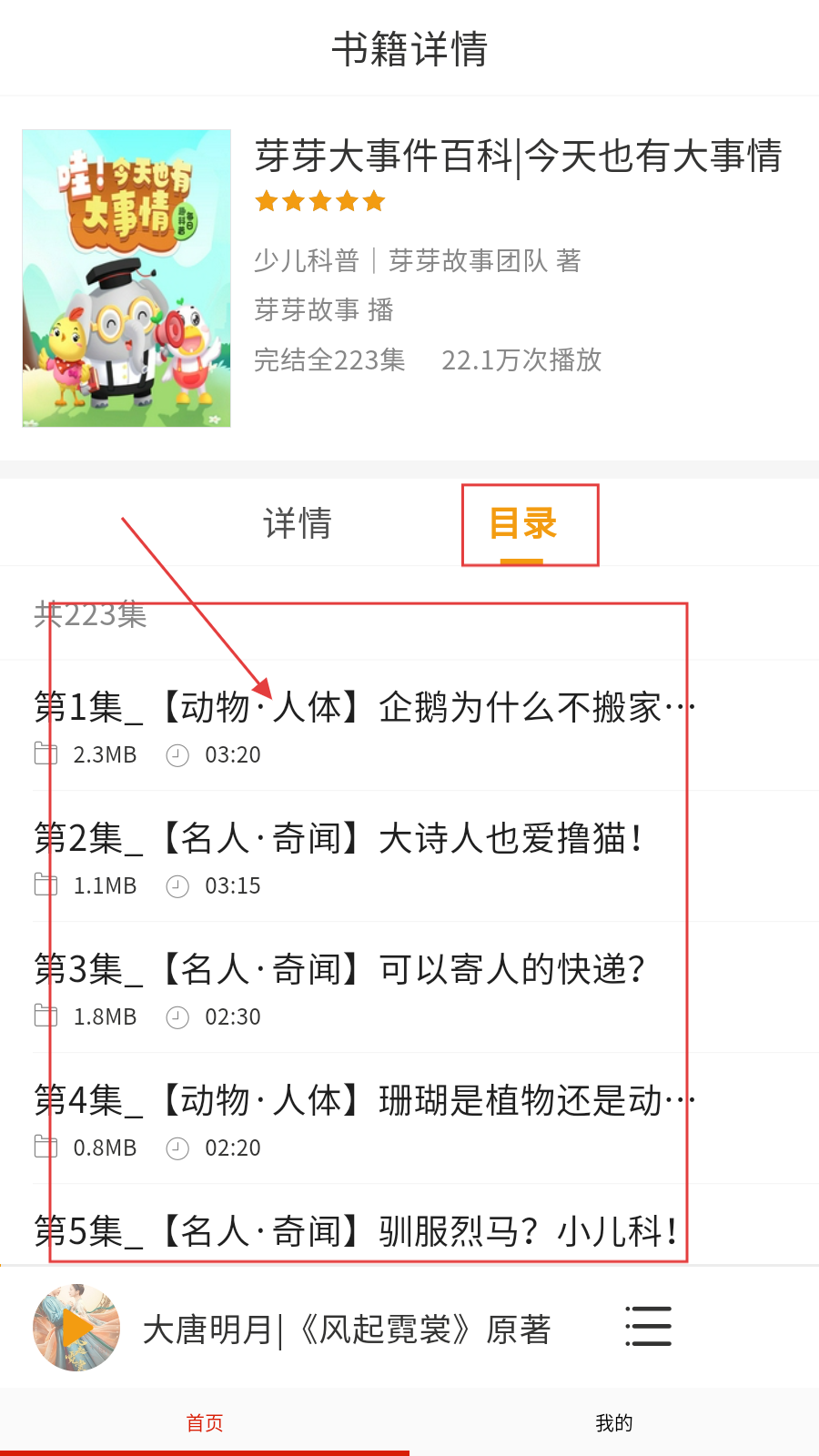 3、在【書(shū)籍詳情】頁(yè),點(diǎn)擊【目錄】選擇要聽(tīng)的集數(shù)并點(diǎn)擊。