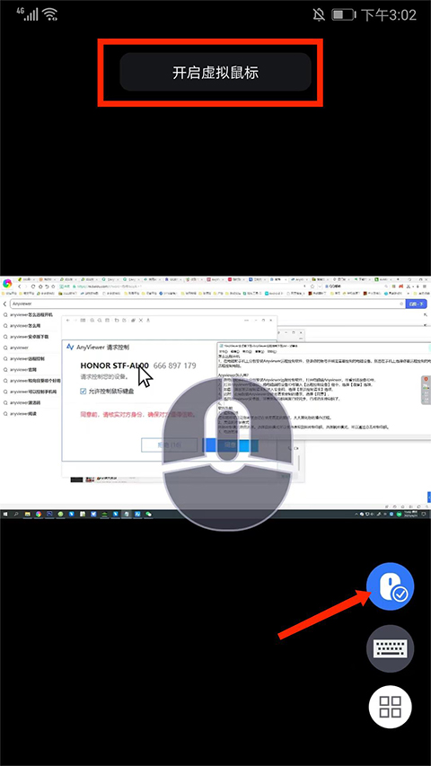 6、點擊【鼠標(biāo)】圖標(biāo),可自行開啟和關(guān)閉鼠標(biāo)模式,在手機上滑動屏幕即可模擬鼠標(biāo)操作了,